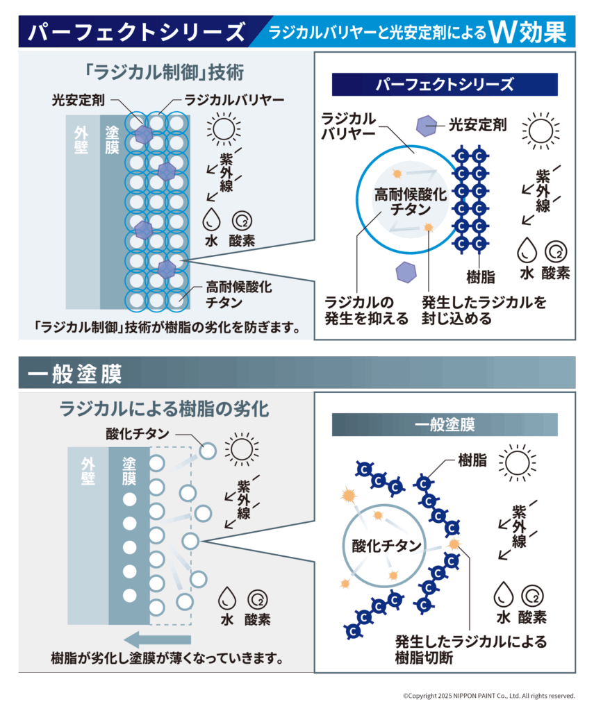 このラジカルの発生を抑える特殊成分(ラジカル制御技術)を使った塗料が、ラジカル制御型塗料です。
