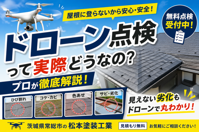 こんにちは!茨城県常総市を中心に外壁塗装・屋根塗装を行っている松本塗装工業です。今回は最近お問い合わせが増えている「ドローン屋根点検」について分かりやすく解説します!■ ドローン屋根点検とは?ドローンを使って屋根の状態を空から撮影し、劣化や...