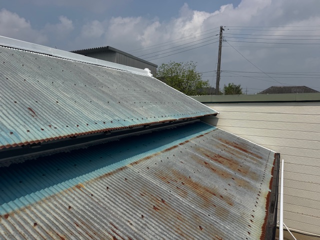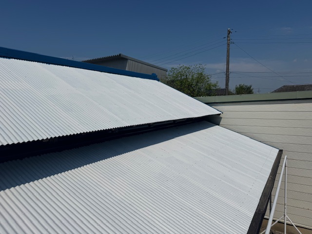 茨城県常総市にお住いのお客様より、物置屋根の劣化が気になるとのご相談をいただきました。長年の風雨でサビや色褪せが見られ、見た目だけでなく耐久性も心配されてました。