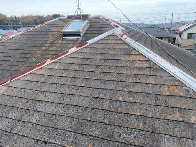 【施工前の状況】竜ケ崎市にお住まいのお客様より、築25年の屋根(スレート屋根)劣化、サビ、コケが気になるとのご相談をいただきました。長年の風雨でサビや色あせ、コケ見られ見た目だけでなく耐久性も心配されてました。